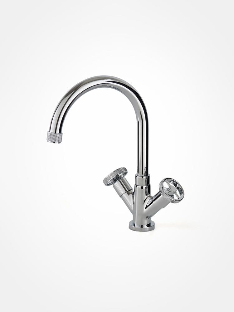 Aldo 1TH sink mixer is supplied with a curved swivel spout and industrial tap heads.