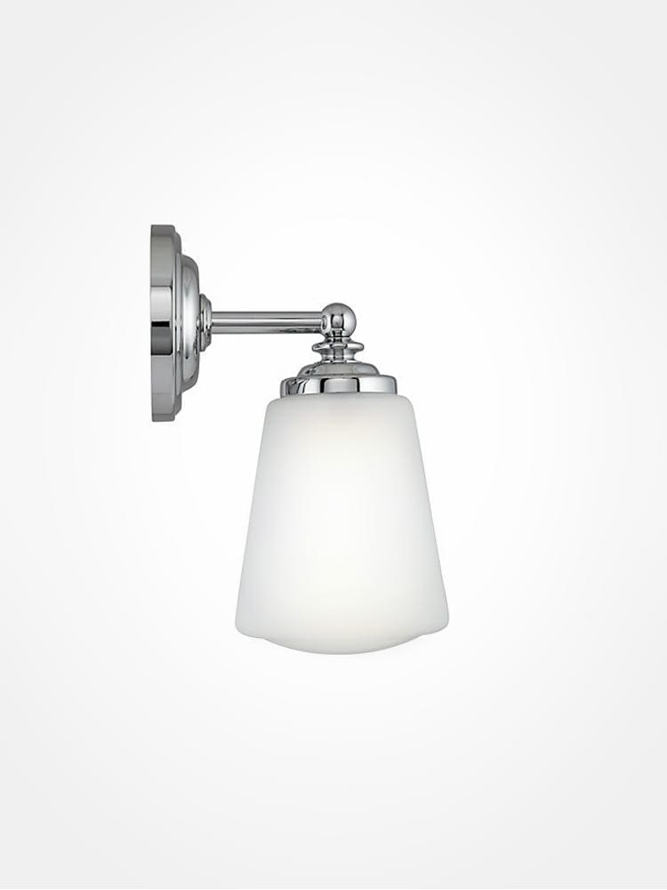 This Anton wall light has a solid brass chrome plated fitting with a white opal glass diffuser.