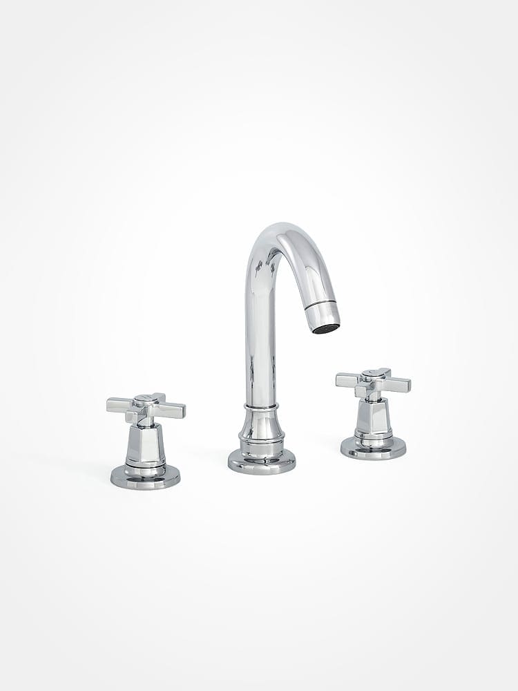 Arte three hole mixer with small swivel spout and quarter turn tap heads.