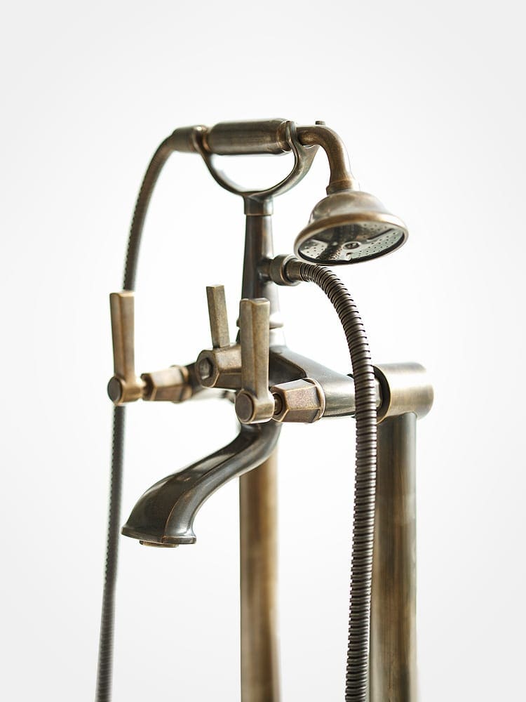 Arte bath mixer with handshower, cradle, diverter & quarter turn Arte levers on overrim Standpipes in Aged Brass finish.