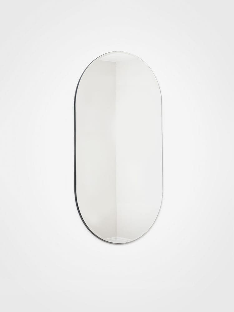 This retro oval mirror has smooth bevelled edging and is set on an MDF matte black painted backboard.