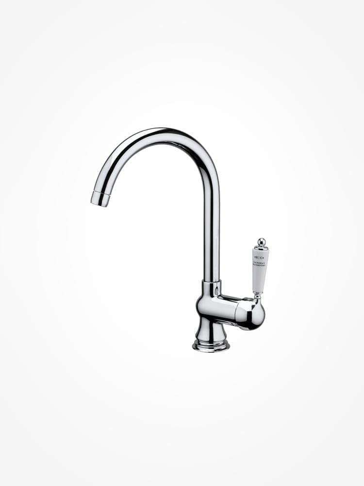 Britannia single lever sink mixer with a curved swivel spout and white lever.