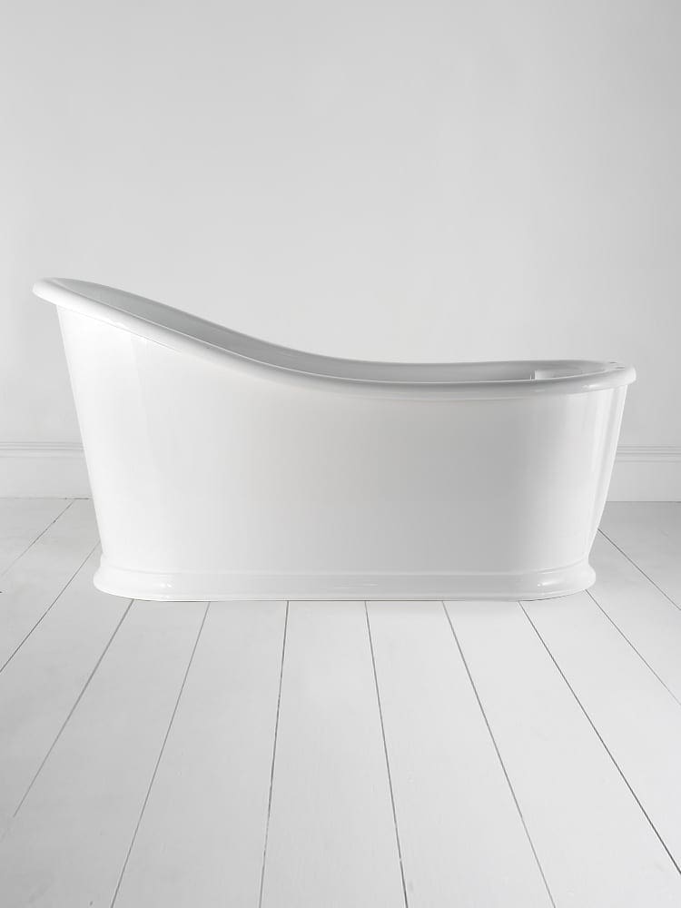 A superbly comfortable bath where one end is raised and sloped creating a cosy lounging position. This skirted slipper bath has a high gloss interior and smooth white moulded exterior.