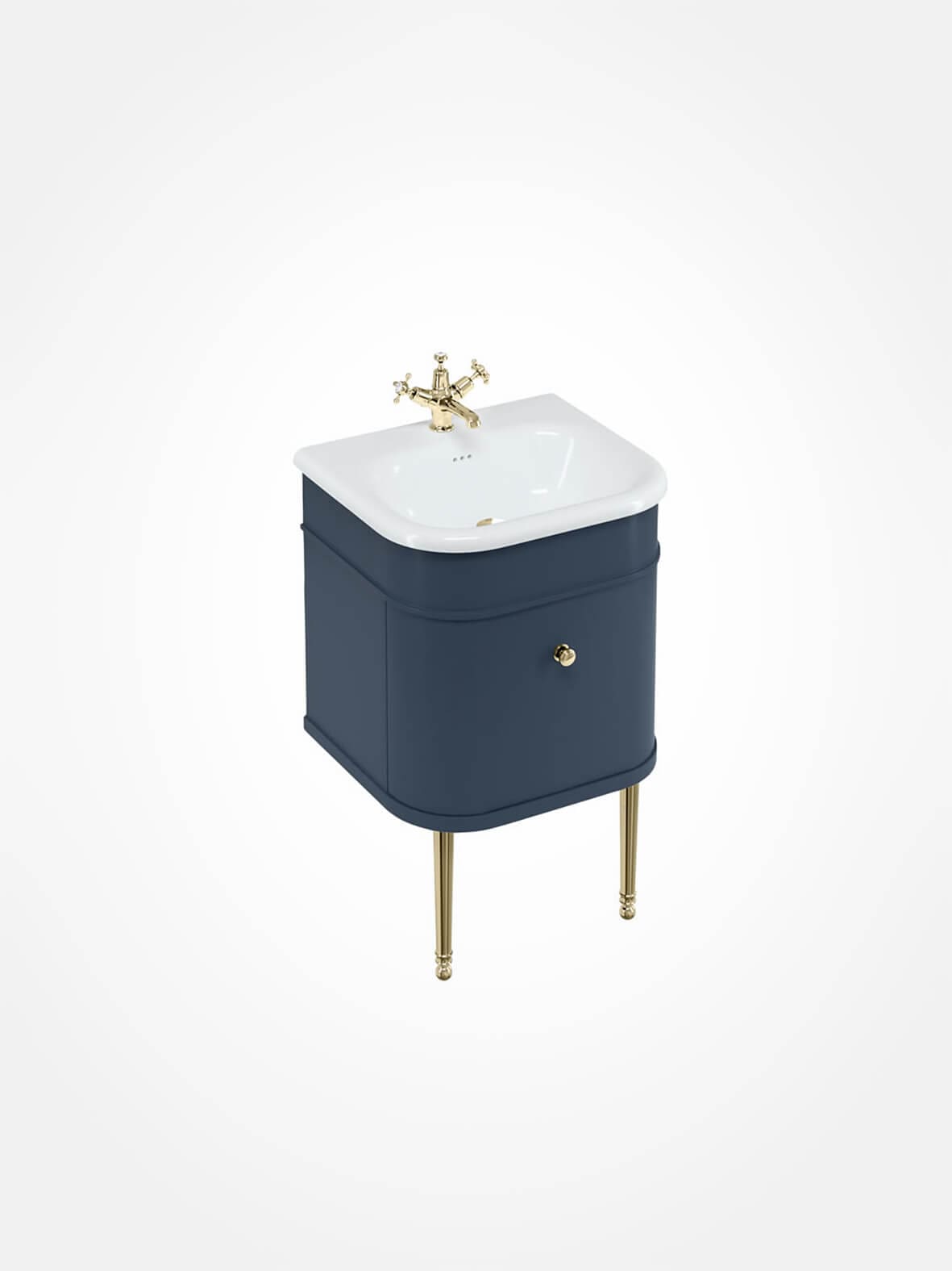 This Chalfont 550mm vanity has a matt blue finish with gold legs and drawer knob. It has a spacious soft-closing single drawer unit.