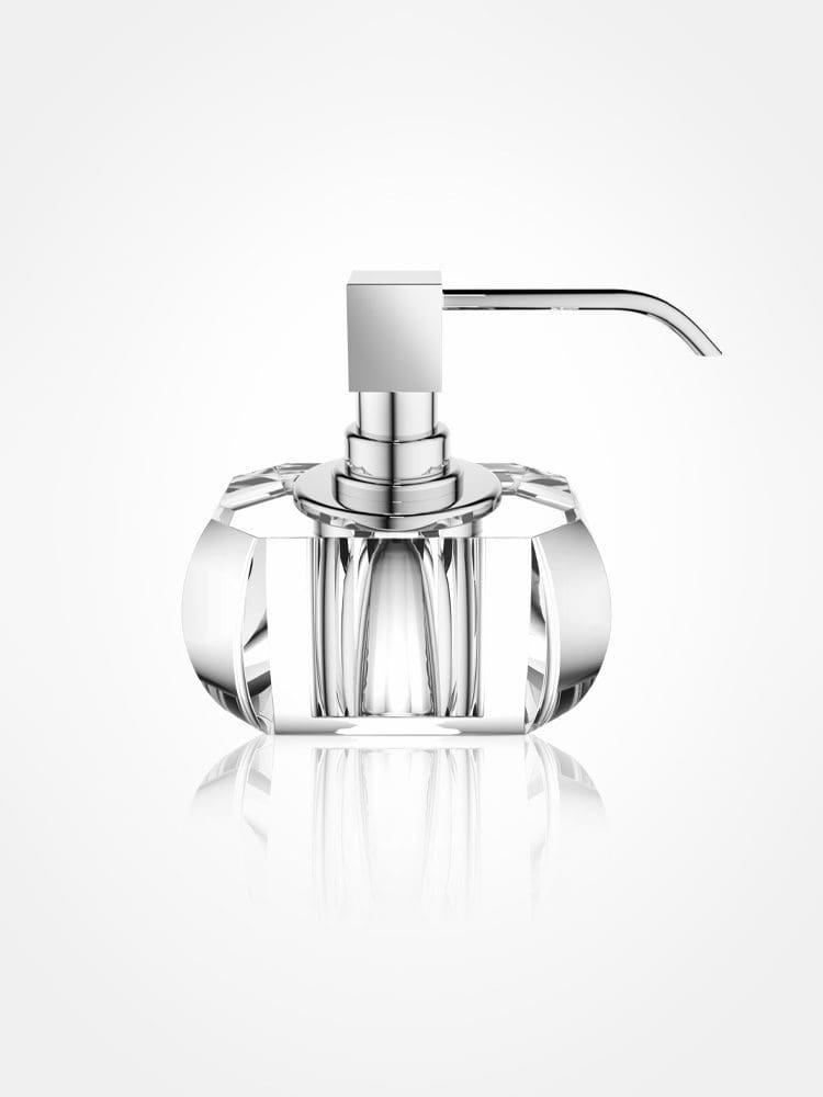 Glass crystal soap dispenser with chrome pump head.