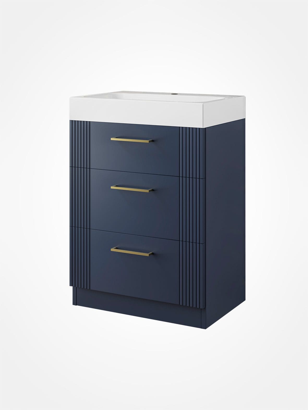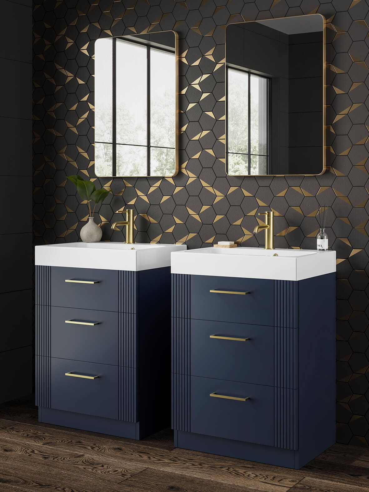 The floor standing Fabrica vanity has a matt Midnight Blue finish with brushed brass handles.