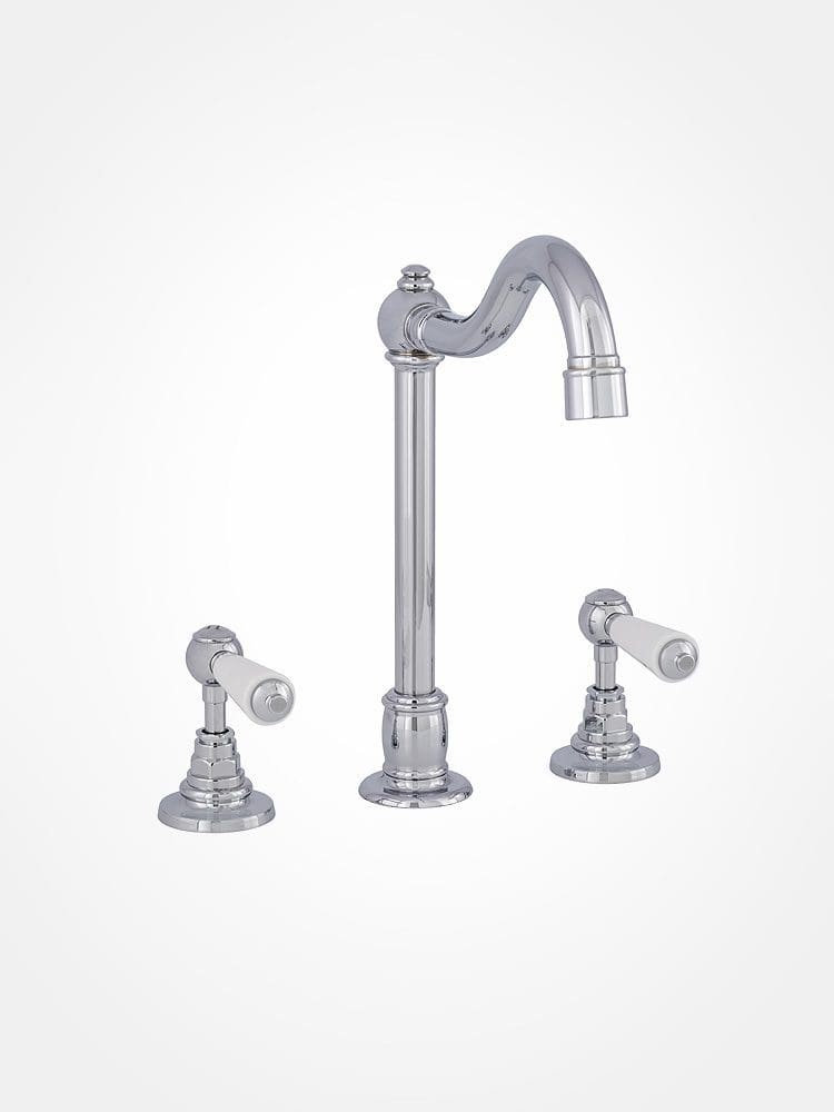 Includes the French high rise swivel spout and a pair of Britannia side valves with levers.