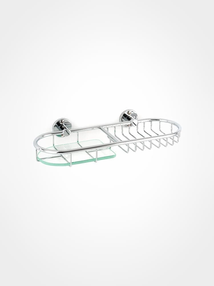 Half of the wall mounted holder is as a glass shelf whilst the other half is a grid shelf.