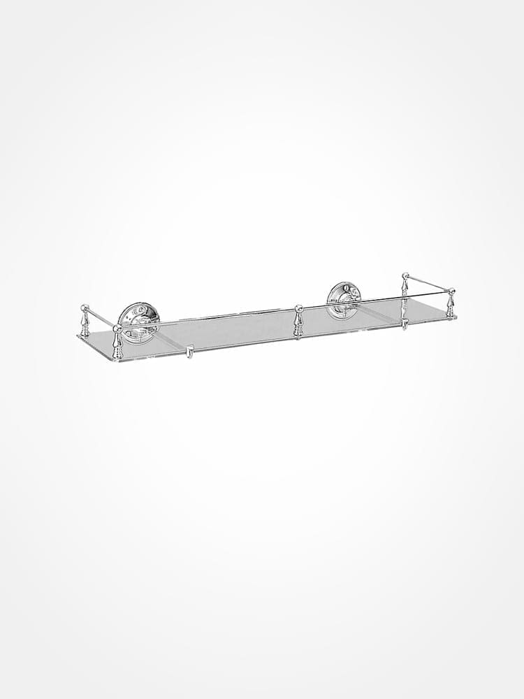 A toughened glass shelf with brackets to secure the glass into place and with a decorative guard rail to prevent anything from slipping off the shelf.