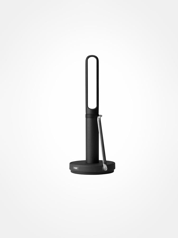 The Vipp kitchen roll holder helps control paper towels in the kitchen. A solid base gives the kitchen roll holder stability, and a stainless-steel arm holds paper towels in place. The Vipp kitchen roll holder is made to fit European standard-sized paper towels.