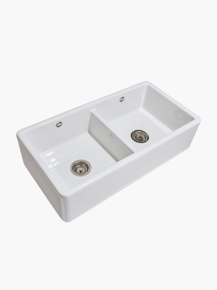 It comprises two large bowls, both of which have 90 mm outlets suitable for basket strainer wastes or a waste disposal unit.