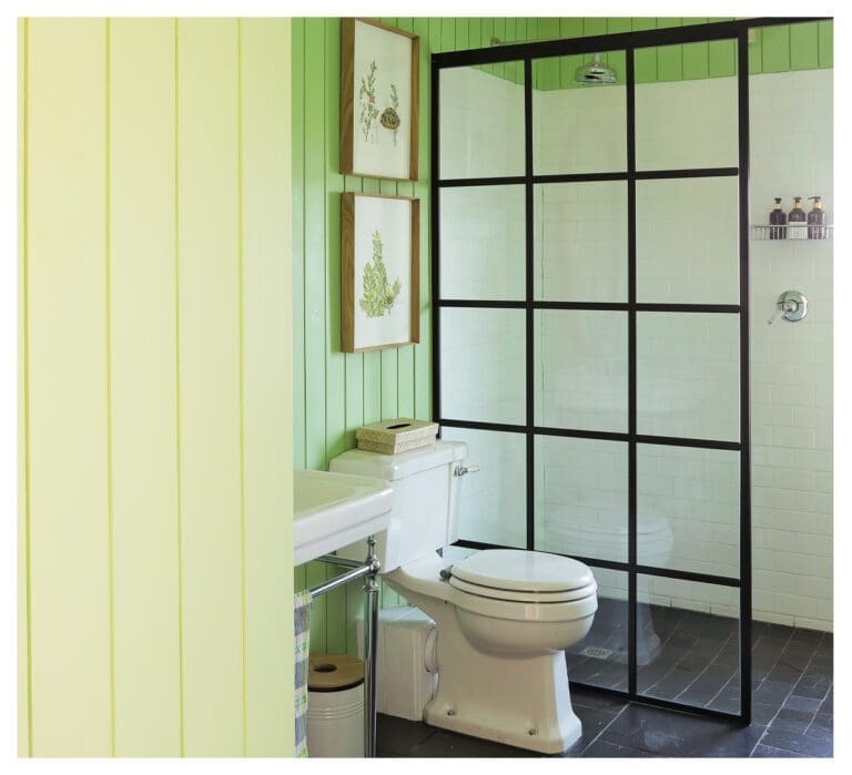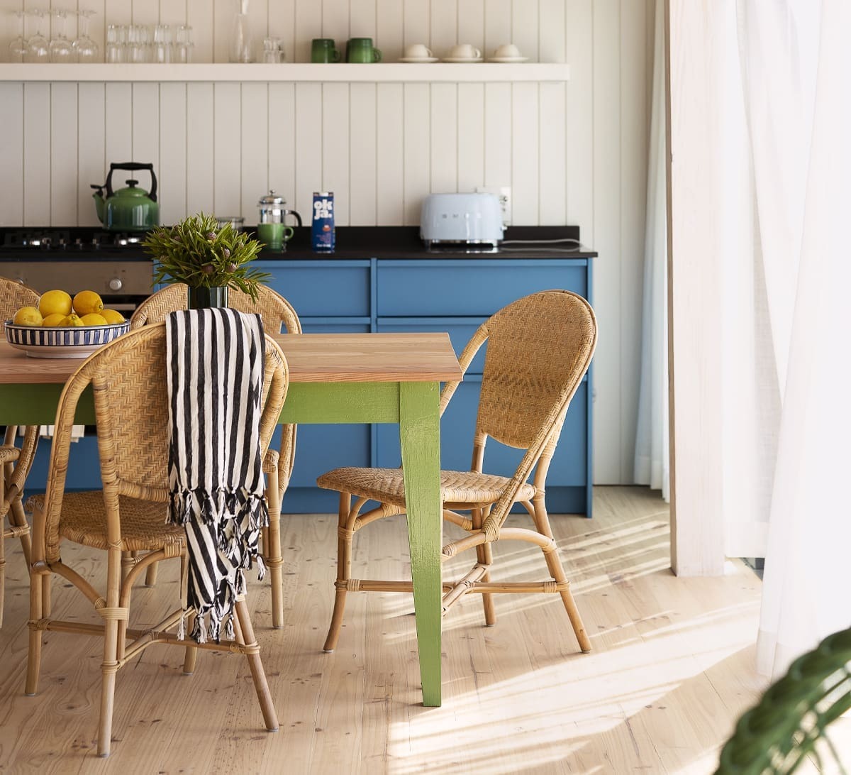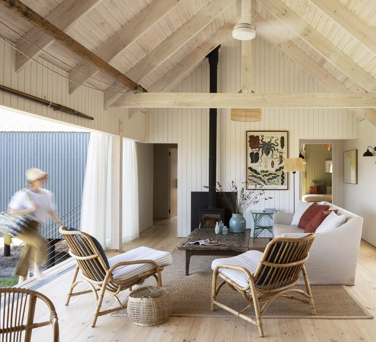 The open-plan design lets the afternoon light fall into and fill up the kitchen, dining area and lounge, with a high-vaulted ceiling that allows air to move freely between the heavy wooden beams. The neutral-coloured walls are contrasted by the bold and bright blues of the kitchen, and the vibrant greens and yellows of the living room. The space is warm and eclectic, the bathroom walls a playful powder blue with ruby-red accents, set off by near-black tiled floors.