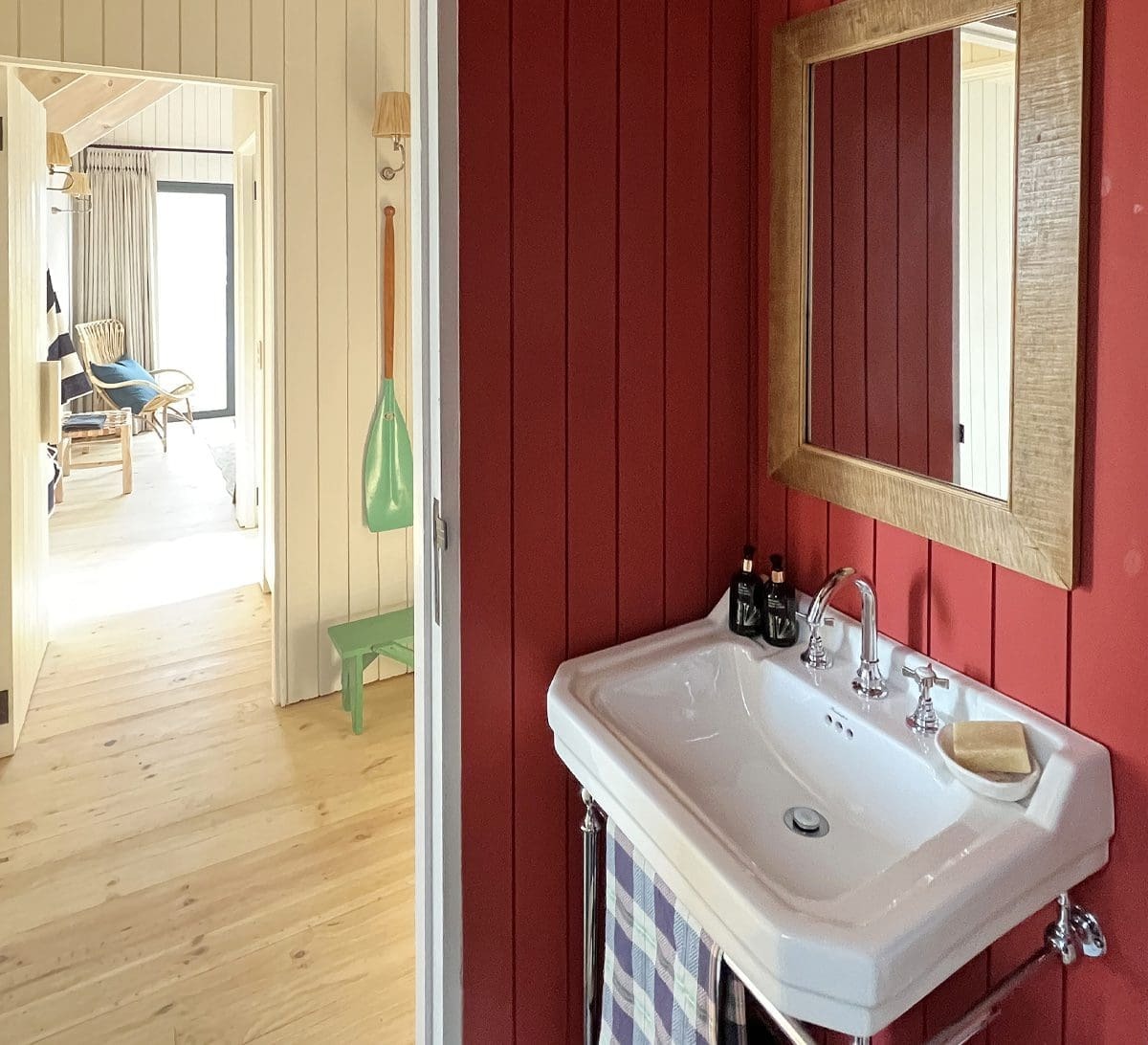 The three-bedroom Port boathouse is similarly styled, dramatic in its mix of ox-blood reds and deep navy blues. The wood-panelled walls are reminiscent of being inside of a boat, and the kitchen, dining and living areas flow into one another in an open-plan design to create a beautiful, vast and breathable space.