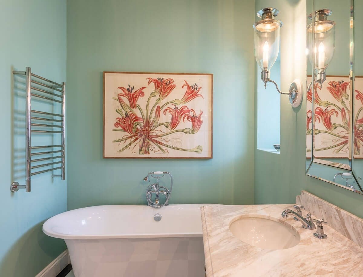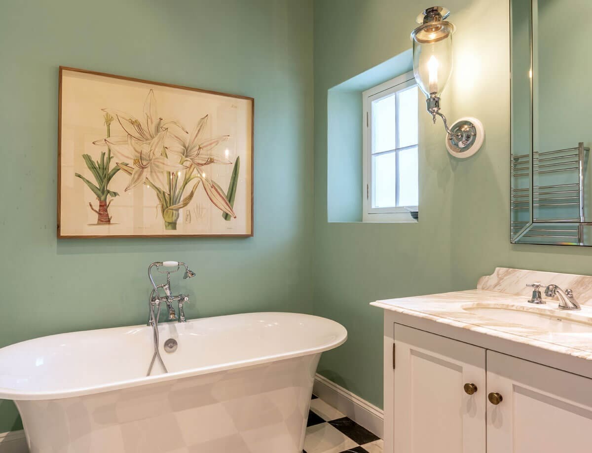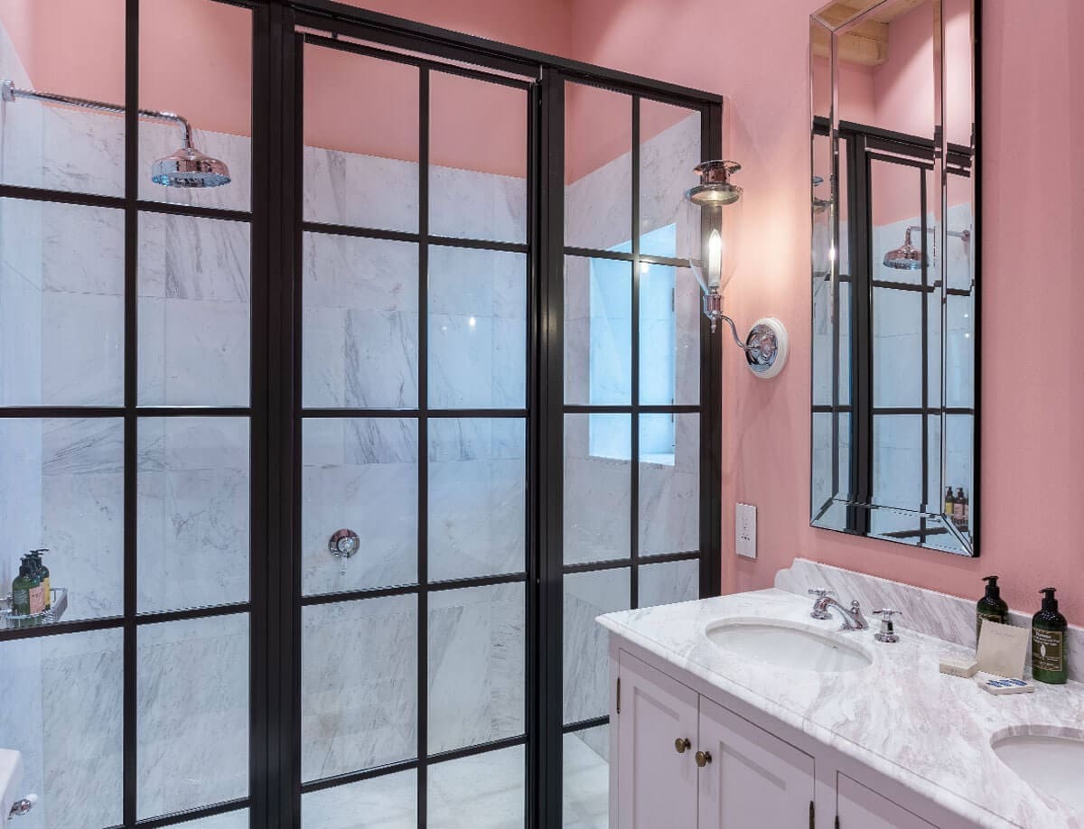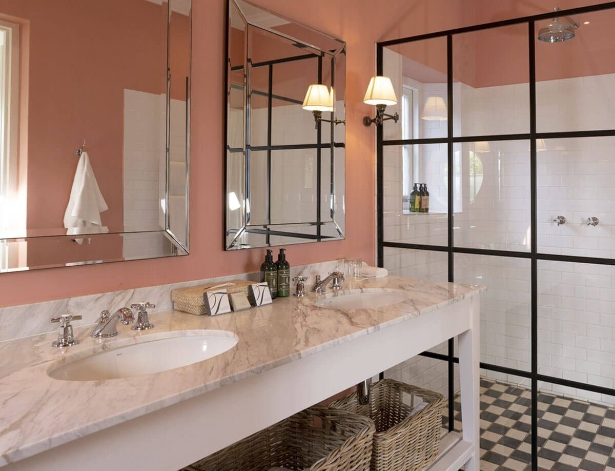 The punchy wall colours combined with black and white marble floors – bespoke shower doors, freestanding baths, farmhouse vanities and traditional sanitary-ware all contribute to a laid back sense of luxury and comfort”.