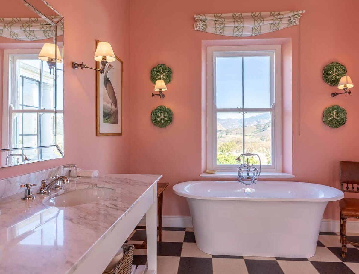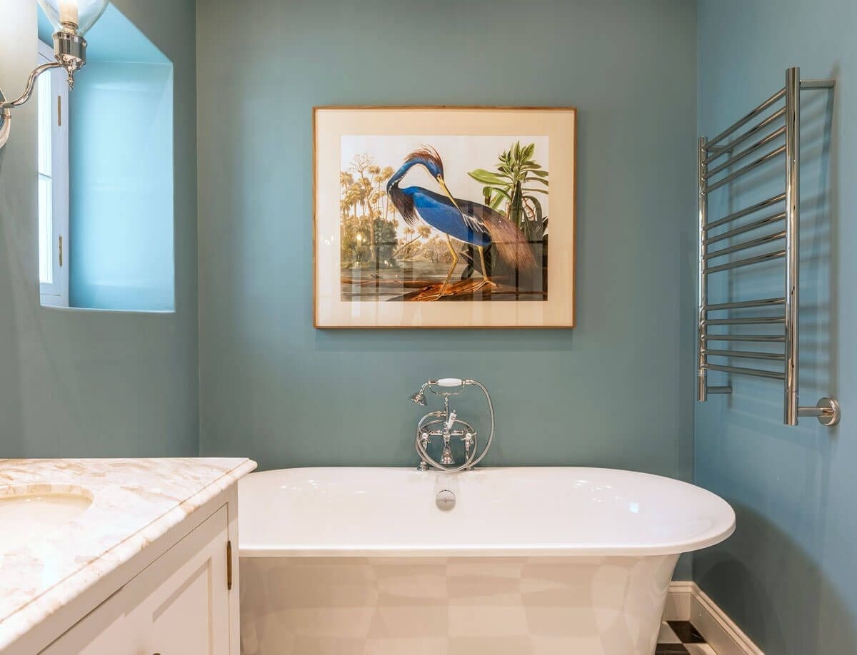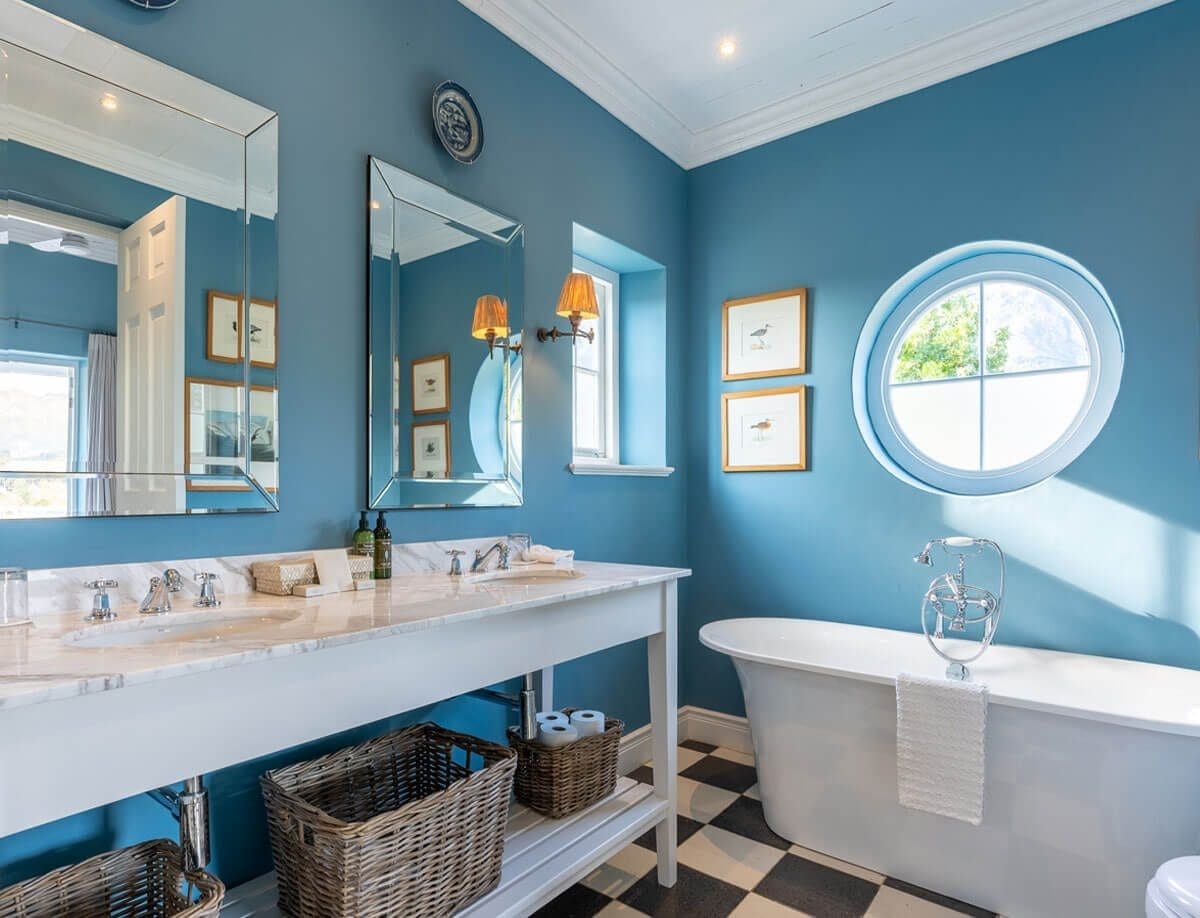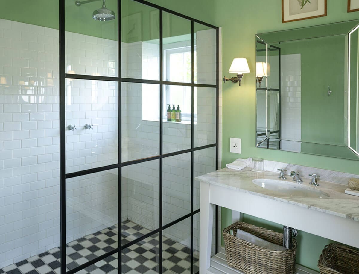 The punchy wall colours combined with black and white marble floors – bespoke shower doors, freestanding baths, farmhouse vanities and traditional sanitary-ware all contribute to a laid back sense of luxury and comfort”.