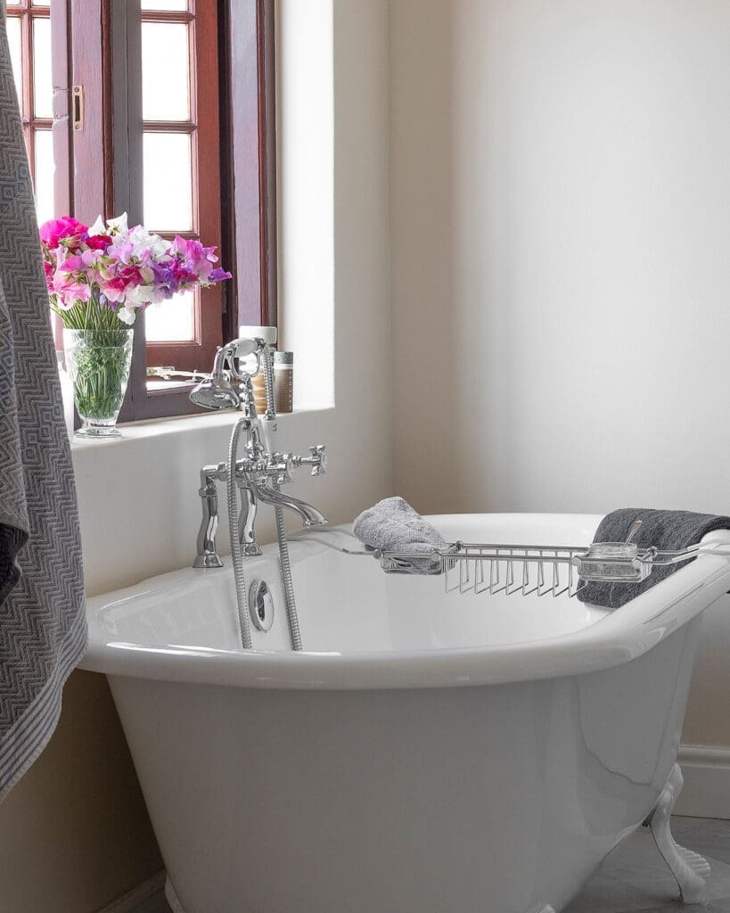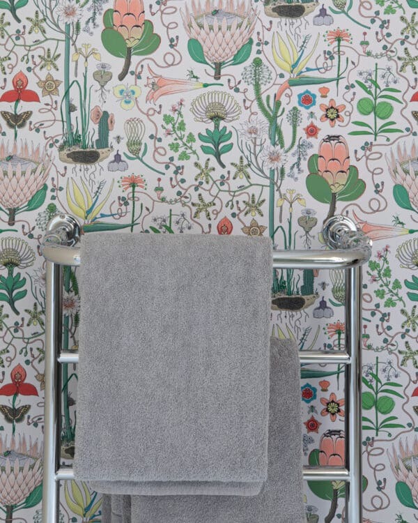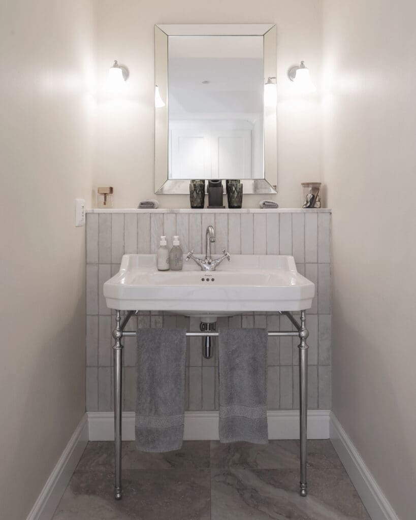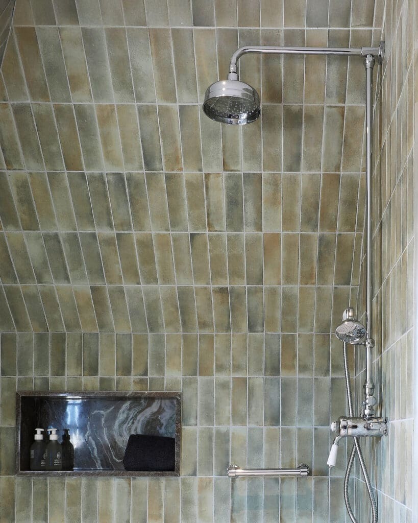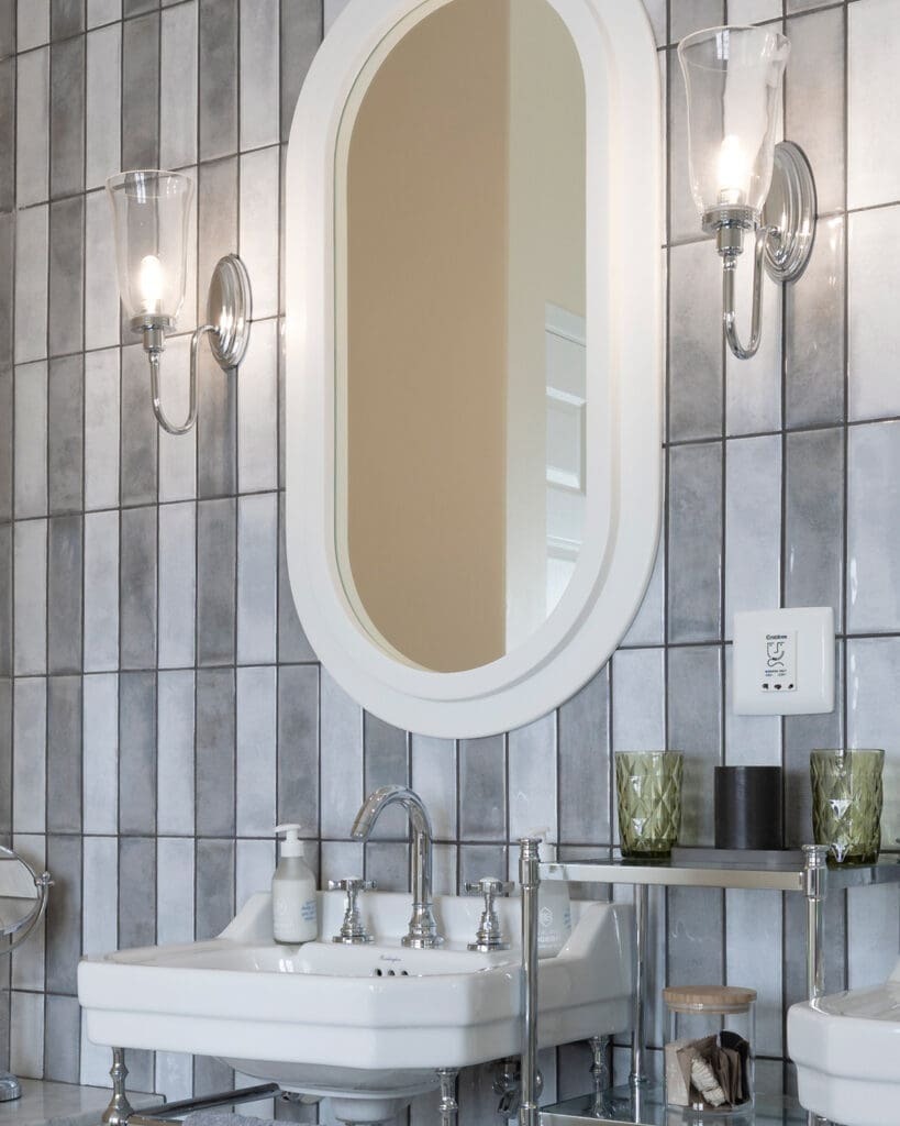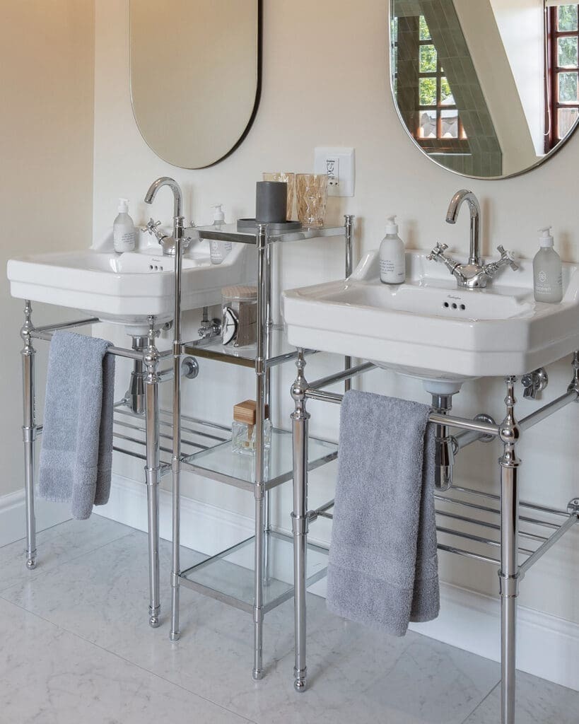 Each suite features twin basins, generous freestanding baths, and oversized showers, all appointed with fittings from Victorian Bathrooms. The design embraces playful tilework and striking wallpapers from Cara Saven Design, resulting in bathrooms that feel both indulgent and deeply personal.