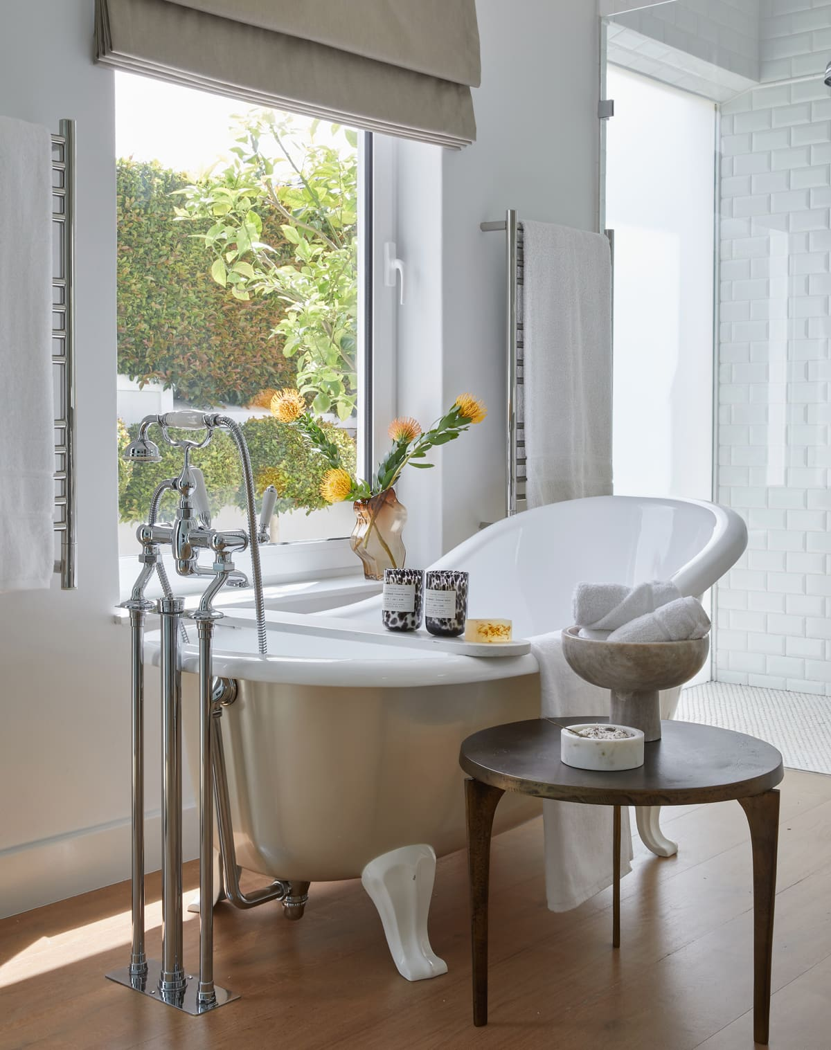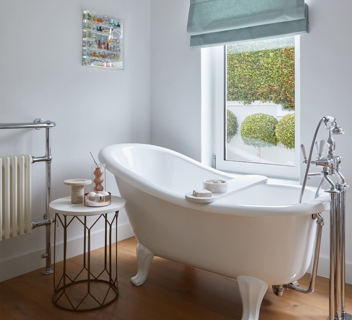 Material choices played a pivotal role in realising this vision. Further classic elements, including crisp subway tiles and a freestanding Chaise bath on Art Deco feet with a traditional bath mixer on stand pipes, anchor the design.