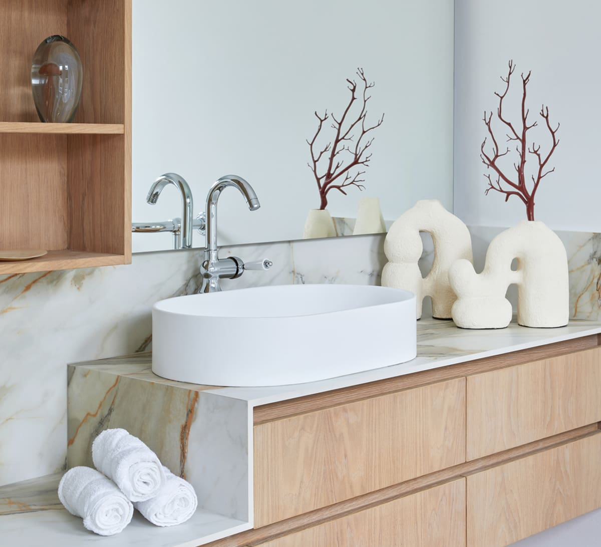 For Natalie and her team, achieving the right balance between functionality and visual appeal was both the greatest challenge and the most rewarding. “One has to constantly prioritise the two until they work together,” Natalie explained. Counter-mounted vanities not only enhanced the aesthetic but offered a solution for efficient storage.