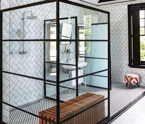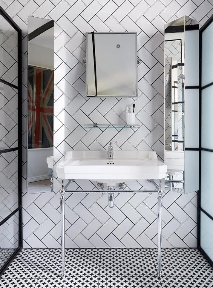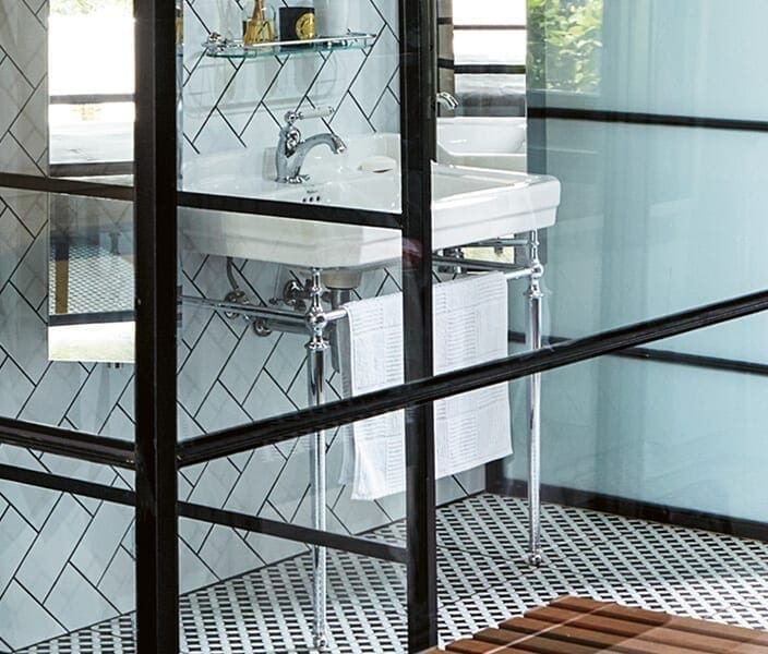 Black metalwork and detailing frame our Britannia Thermostatic shower mixer, mounted on fired white tiles with black grout for contrast while our Burlington Basin mounted on its chrome stand has pride of place just alongside. While this basin stand is quite classic in style it lives comfortably alongside the more industrial chic finishes surrounding it.